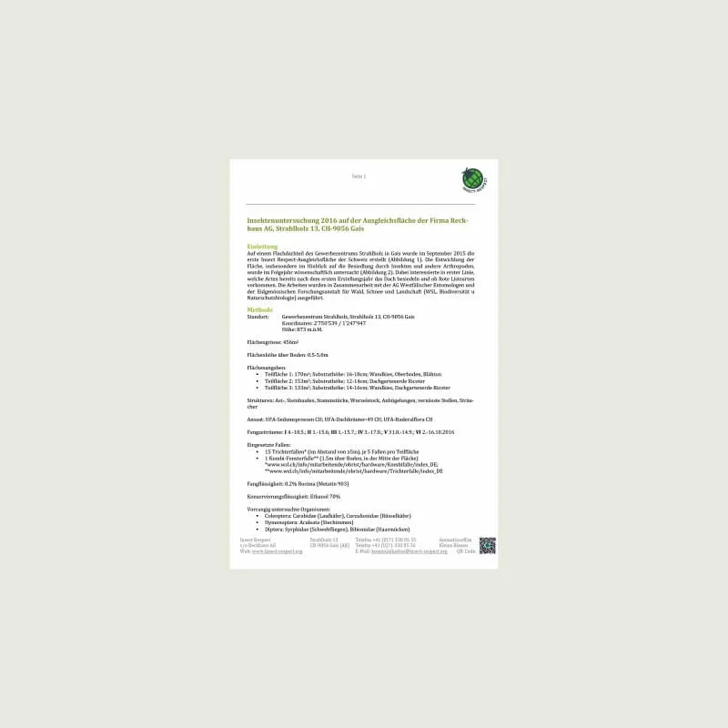 In Zusammenarbeit mit der AG Westfälischer Entomologen und der Eidgenössischen Forschungsanstalt für Wald, Schnee und Landschaft erstellte Insect Respect für die beiden geschaffenen Ausgleichsflächen in Bielefeld und Gais Forschungsberichte. Ein Jahr nach Erstellung der Flächen untersuchten Wissenschaftler die Entwicklung und Art der Besiedlung der beiden Dächer.